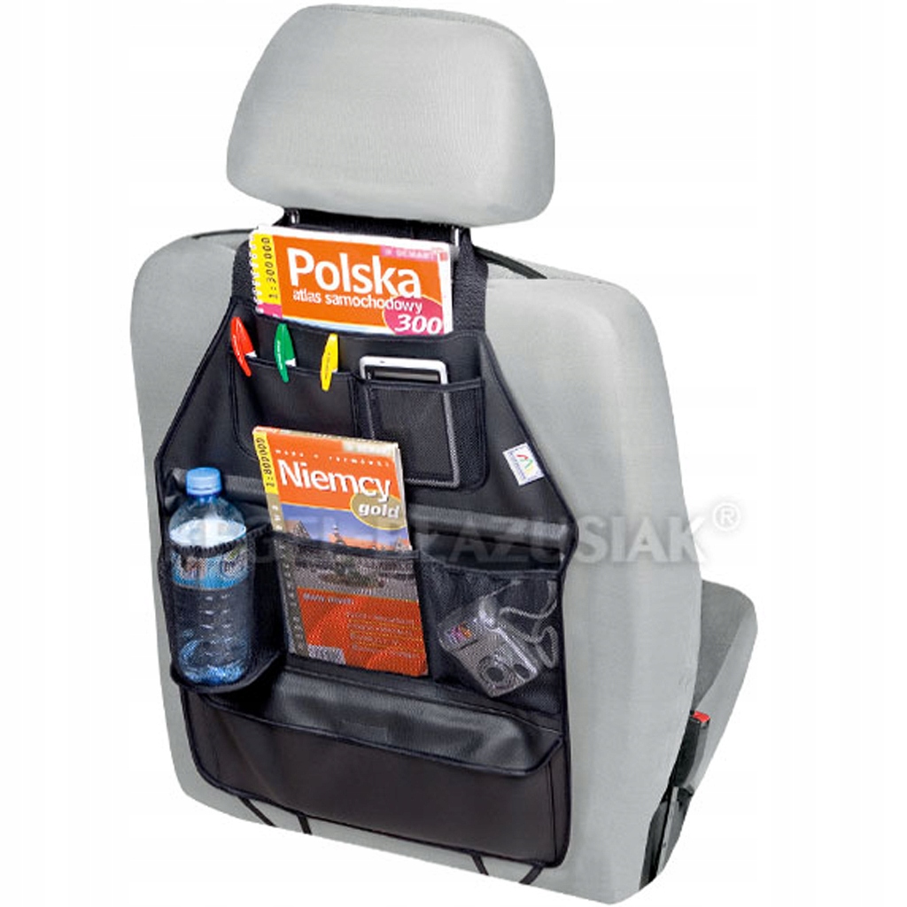 Organizer pasuje na tył każdego fotela. Pozwala nie tylko na przechowywanie rzeczy, ale również chroni fotel od strony tylnej.